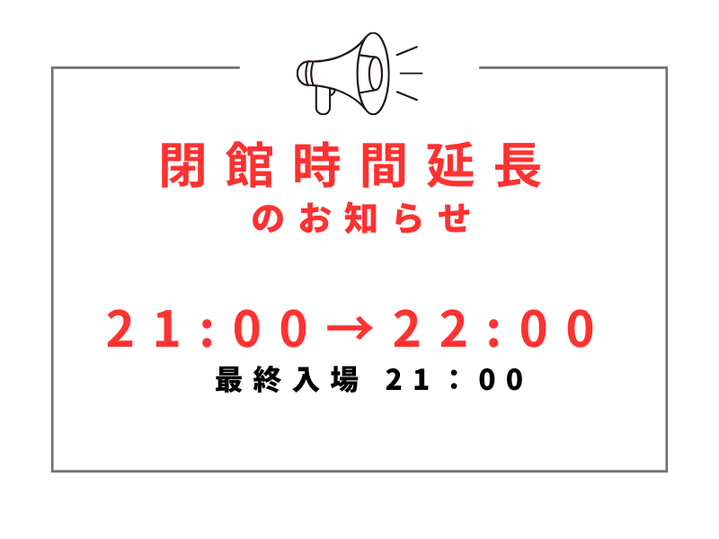 なお、最終入場時間は21:00までとさせていただきます。